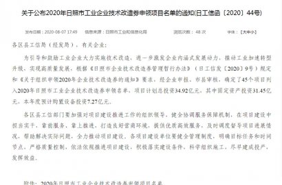 根據(jù)《日照市企業(yè)技術(shù)改造券管理暫行辦法》(日工信發(fā)〔2020〕9號(hào))規(guī)定和《關(guān)于組織申領(lǐng)2020年企業(yè)技術(shù)改造券的通知》要求,經(jīng)積極申報(bào),通過市工業(yè)和信息化局審核,成功申領(lǐng)2020年日照市工業(yè)企業(yè)技術(shù)改造券。